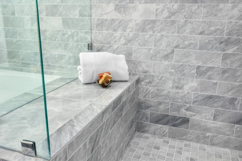 - Double Sinks, Full on Ground Floor, Marble, Primary - Oversized Tub, Primary - Tub with Jets, Shower and Tub, Stall Shower - 2+, Stone, Tub, Updated Bath
