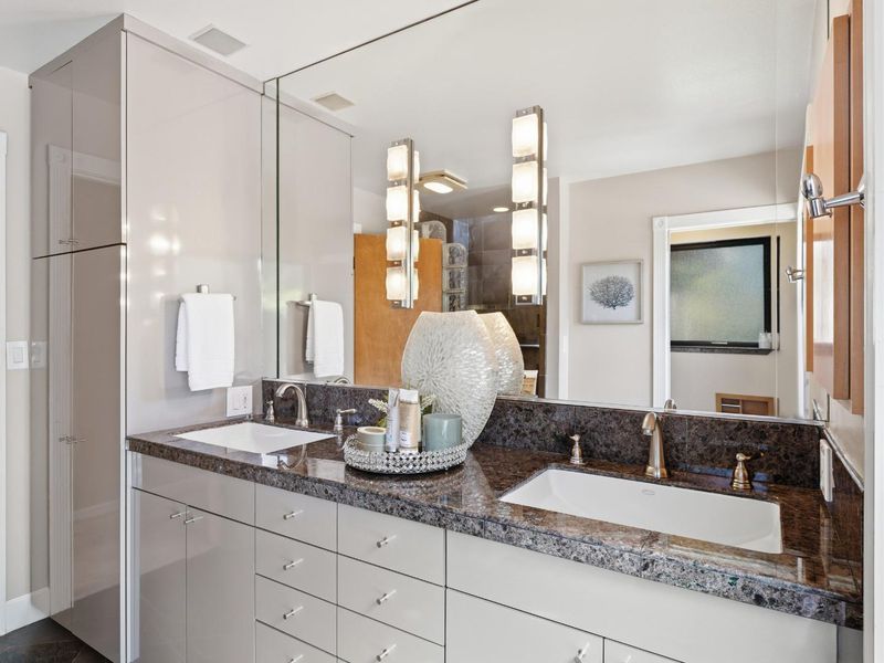 - Shower over Tub - 1, Double Sinks, Granite, Stall Shower, Stone, Updated Bath, Full on Ground Floor, Oversized Tub, Primary - Stall Shower(s)