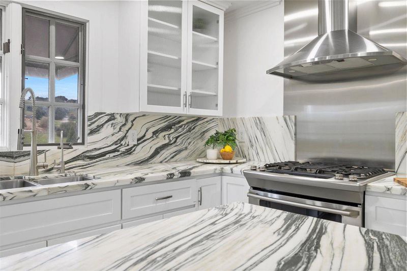 - Cooktop - Gas, Countertop - Marble, Dishwasher, Exhaust Fan, Garbage Disposal, Hood Over Range, Island, Microwave, Oven - Double, Oven - Gas, Oven Range - Built-In, Pantry, Refrigerator, Warming Drawer