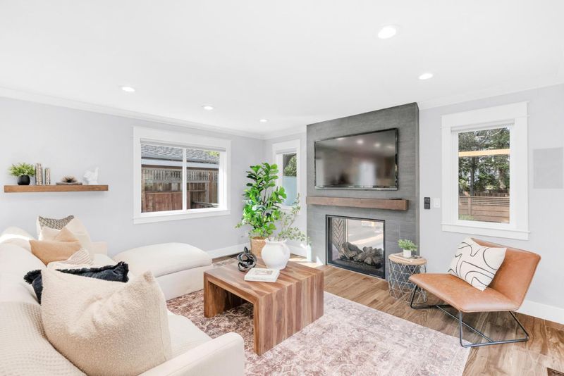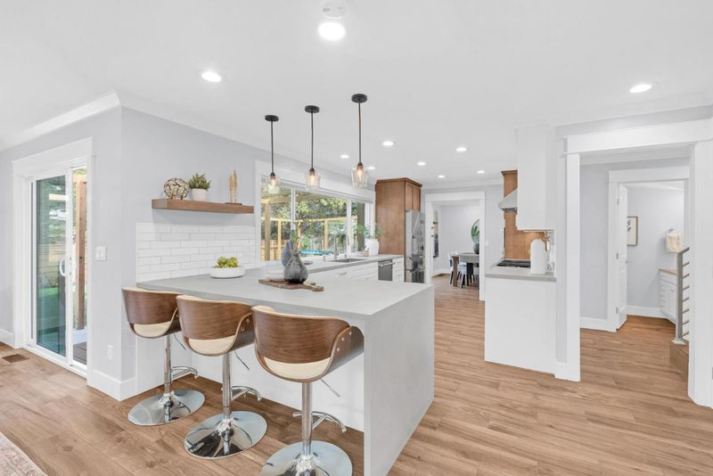 Impeccably renovated home designed for effortless entertaining and everyday comfort. This 5-bedroom home includes a convenient main-level bedroom, 2.5 bathrooms, expanded by 150 sq ft, the home offers over 2,212 sq ft of living space, highlighted by a spacious family room with a bar area and a stunning see through fireplace that opens to the serene backyard. The spacious family room features a bar area and a striking see-through fireplace that opens to the serene backyard. The living room offers a bay window overlooking the front patio, while the formal dining area connects seamlessly to outdoor seating through French doors. The kitchen showcases quartzite countertops, Thermador and Samsung appliances, pot filler, hood range, and modern cabinetry. Andersen French doors and Milgard sliding doors create seamless indoor-outdoor flow to a lush backyard with mature trees and a picturesque creek setting. The backyard includes an outdoor BBQ kitchen, refrigerator, pool table, saltwater hot tub, TV, and Sonos speakers. Additional highlights include dual-pane windows, custom tile flooring, remodeled bathrooms, crown molding, updated carpet and paint, epoxy garage with built-ins, tankless water heater, new landscaping with lighting, two storage sheds, and central AC and heating.