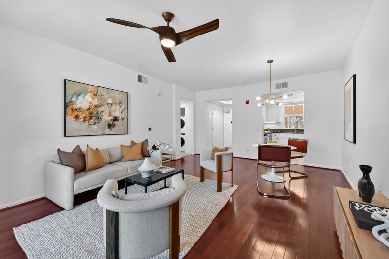 Stylishly updated home in the gated Midtown Plaza community overlooking O'Connor Park. Fresh interior paint, freshly painted kitchen cabinets, and laminate flooring highlight the open living space with granite countertops, stainless steel appliances, a brand new dishwasher, new in-unit washer/dryer, and a brand new modern contemporary ceiling fan and lighting fixture. The renovated bathroom features a sleek shower stall with niche and infinity drain. The bright bedroom offers abundant natural light and a walk-in closet with built-in shelving. Enjoy a private balcony with peaceful park views. Community amenities include pool, fitness center, clubhouse, and secure underground parking with elevator access. Convenient to Hwy 280, Santana Row, Valley Fair, shops, restaurants, and cafes.