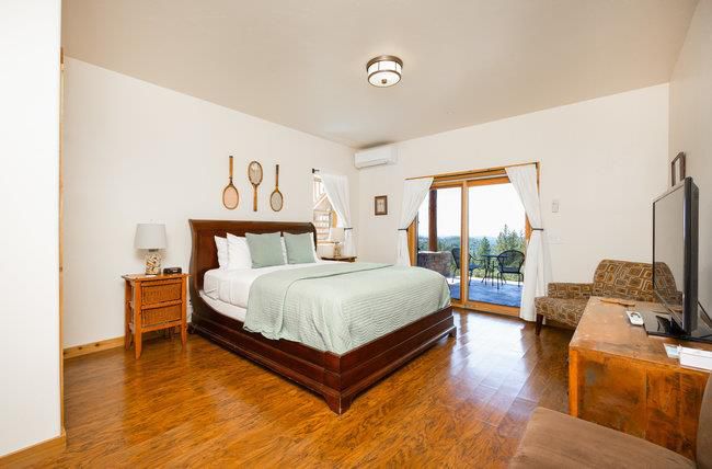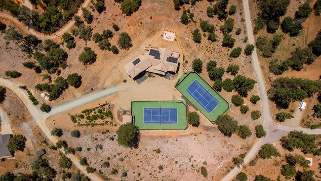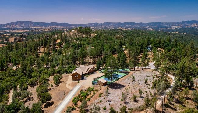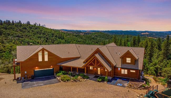 Extraordinary opportunity awaits buyers seeking a private estate, luxury vacation rental, duplex, or boutique inn conversion. This architectural masterpiece offers over 8,000 sq. ft. of breathtaking log construction on 5 scenic hilltop acres in Murphys, ideally situated between Lake Tahoe and Yosemite. Originally designed and built as an award-winning Bed & Breakfast by renowned Bay Area tennis professionals, this meticulously maintained property blends rustic elegance with modern infrastructure. The estate features: guest suites with ensuite baths, professional-grade commercial kitchen, dramatic 23-foot Great Room with a 10' stone fireplace & wet bar, Loft/Library, game room, Office/Den, oversized laundry room, massage room, private apartment w/separate entrance and second kitchen. Outdoor highlights include: Two regulation-size tennis courts, Dual EV chargers, Tesla Powerwalls, Generac backup generator, Two central A/C units plus eight mini-splits, Quadruple water filtration system, on-site well servicing gardens and filtered water supply, drought-tolerant professional landscaping. Enjoy sweeping 360° panoramic views from this commanding hilltop setting. A rare opportunity to own the real estate not the business and reimagine this exceptional property to suit your vision.