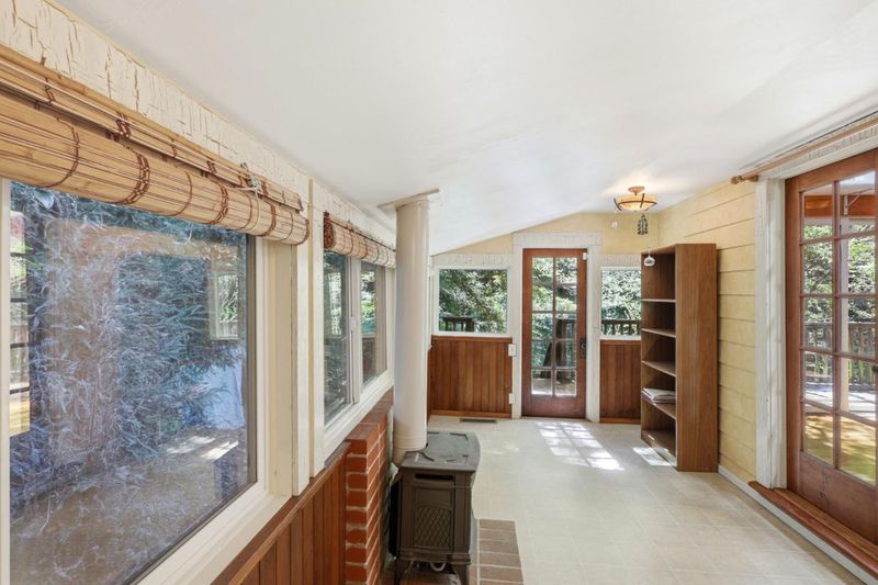 Nestled among redwoods on a beautifully landscaped .5 acre lot, this stunning 1,819 sq ft two story home offers a rare blend of privacy, craftsmanship, and convenience. Built entirely from old growth redwood, including the siding and 8' privacy fence, this home is as durable as it is distinctive. A fully fenced property makes it ideal for pets, complete with a outdoor living space looking over Bear Creek. Inside, the home is filled with natural light with floor to ceiling windows, skylights, and patio doors. The living room features a dramatic high vaulted ceiling and a fireplace, perfect for relaxing or entertaining. Rich hardwood flooring runs throughout. The updated kitchen showcases silestone countertops and custom cabinetry, blending modern functionality with rustic charm. A bonus room with wraparound windows offers the perfect space for a home office, or sunroom. Outdoors, the lush grounds feature an impressive variety of plants, Ca natives, fruit trees, bamboo, cacti, tropicals, and rare species creating a vibrant and ever changing landscape. A roundabout driveway and a covered carport complete the property. Enjoy a peaceful mountain lifestyle with an easy 20-minute commute to Los Gatos via scenic Bear Creek Road, avoiding most of hwy 17. Walking distance to downtown.
