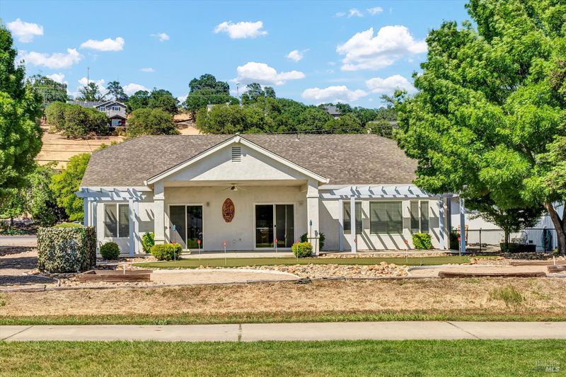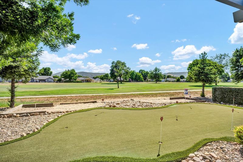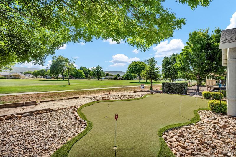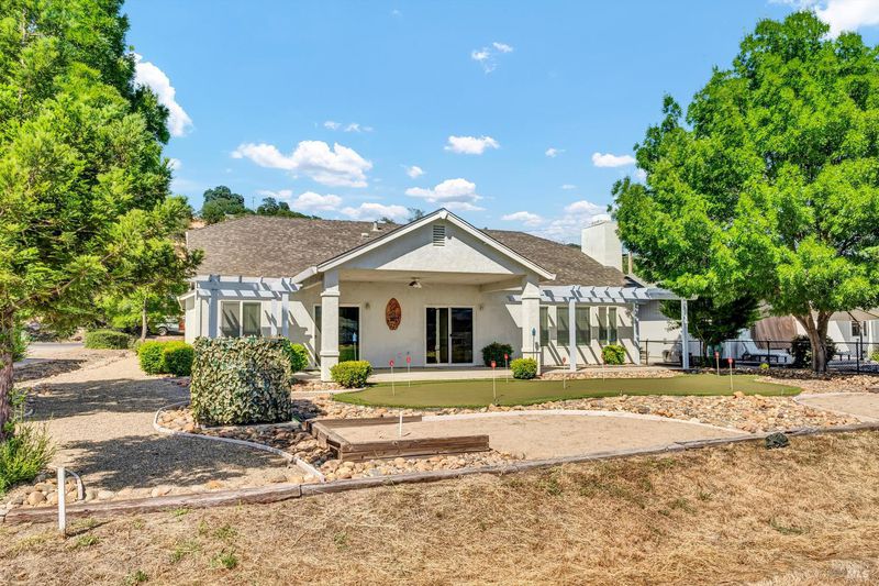 Huge Reduction - Priced to Sell! Situated on the 3rd Fairway at Hidden Valley Lake's Championship Golf Course, this 3 bed / 2 bath single level home offers 1,807 SF of spacious living space. Beautiful stucco home with new exterior paint and low maintenance landscaping will catch your eye from the road. Large level driveway with plenty of room for parking + a 3 car garage for your vehicles, golf cart or storage! The tiled entry leads to the spacious living room with vaulted ceilings and new vinyl plank flooring. Stately propane fireplace with brick hearth is a nice focal point in the space. The kitchen is open to the living room with a center island, tiled countertops and loads of storage cabinetry. Dine at the breakfast bar, dining nook or formal dining room off the entry. Desirable separation floorplan with 2 guest bedrooms & bathroom on one end with primary and full laundry room with utility sink on the other. Access the back patio from the living room or the primary bedroom. The views from the covered patio of lush green grass year round with surrounding hills in the distance will never get old! Up for some competition? A custom 9 hole putting green with fringe for chipping or the built-in horseshoe pit provides endless outdoor entertainment!