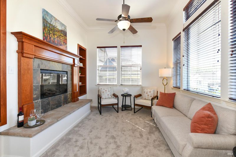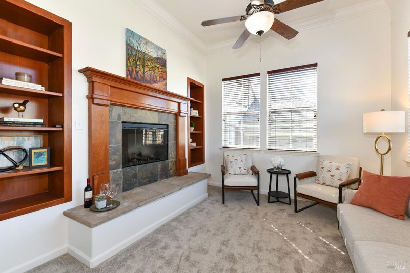 Come home to a hint of the Italian Riviera. After the warmth of a summer day, step inside to the cool calm of high ceilings, the gentle swirl of ceiling fans, and beautiful slate floors stretching ahead through arched doorways. Just to the right of the entry, a gracious front sitting room welcomes guests with soaring ceilings, a ceiling fan, and its own fireplacean inviting place for conversation, a quiet glass of wine, or greeting friends before the evening unfolds. You will naturally gravitate to the spacious kitchen, dining, and family room. Life revolves around the kitchen, and this one makes it a joy. A generous quartz island offers counter seating, cabinetry, and a double sink, illuminated by pendant lighting. Beautiful wood cabinets with pull-out shelves, a large pantry, gas cooktop range, built-in oven, and microwave make the space both elegant and practical. Just beyond an arched alcove is a separate bar with wine fridge and glassware cabinet. The open family room is anchored by a raised-hearth fireplace and built-in shelving, while the glass door invites friends and family outside to a sunny patio with arbor, a stretch of lawn, and garden accents of ornamental cherry, citrus, and roses. The ground-floor primary suite is a relaxing retreat, with afternoon light slanting through French doors that open to the backyard. The luxurious bath evokes a touch of Venice with its decoratively painted Harlequin walls, soaking tub beneath a glass-block window, separate glass shower, double sinks, and a dedicated sitting vanity nook. The walk-in closet offers abundant built-in drawers and shelving. Upstairs feels like a quiet turret away from the busy world, with a large open loft featuring built-in wall cabinetry and console, plus a cozy alcove with a built-in daybed. A spacious guest room with walk-in closet and full bath sits nearby, along with a second flexible room suited for a bedroom, office, studio, or personal gym. For those who appreciate a well-equipped garage, this one delivers: walls of storage cabinets and a long workbench with pegboard create the perfect space for projects and storage. When you're ready to head out, nearby trails and golf courses offer endless ways to enjoy the surroundings. The best of all worlds AND you have paid for Solar.