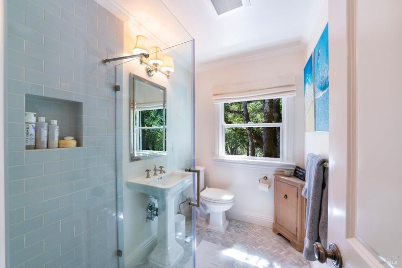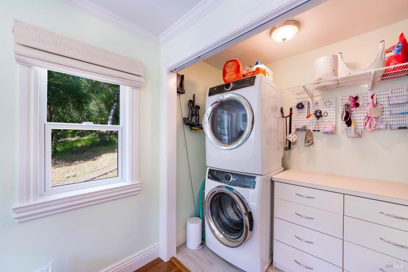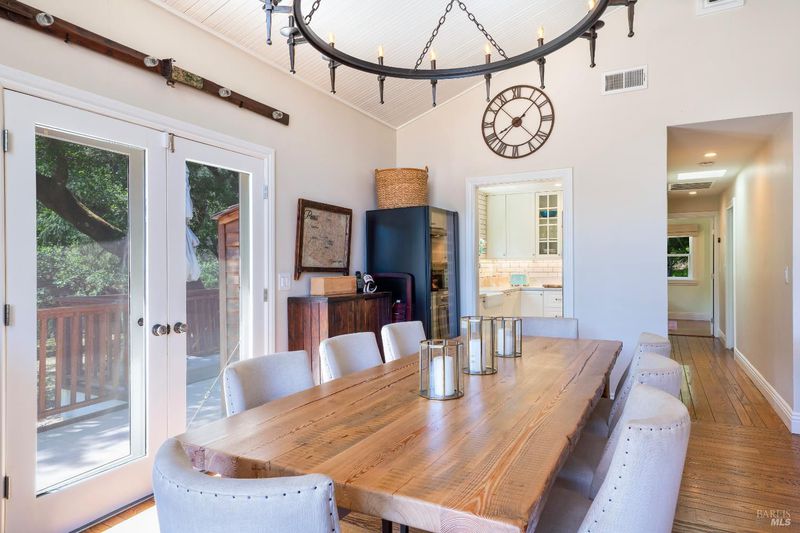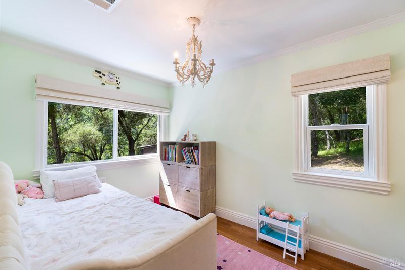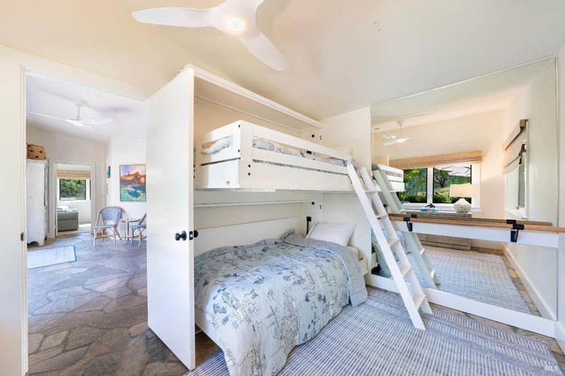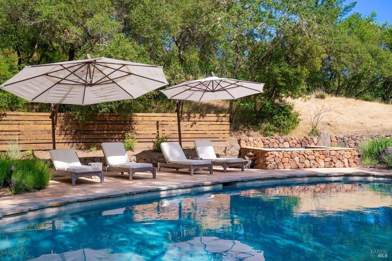 Sited in a serene valley at the foothills of the famed Mount Veeder, along the Mayacamas Mountain range, sits a picturesque retreat. More than just a home, the property is a playground for entertainment lovers. Meditative hiking paths and resort-like features offer a wide range of activities including swimming, bocce, volleyball, gardening, and stunning 360 views. Enter through the private gate and you're instantly transported, where the sounds of birds and meandering deer replace city sounds. Minutes from Yountville, St. Helena, and Napa, it offers solitude with easy access. Vintage inspirations blend with modern smart home updates, including vaulted ceilings, exposed beams, wide-plank floors, and French doors for seamless indoor-outdoor flow. The kitchen features quartz counters, vintage hex tile, bespoke appliances, and garden views. The completely remodeled main home with 2BD/2BA, including a luxurious primary suite. A charming pool house with Nano Doors creates two rooms for guest overflow, a kitchenette, and a full bath. Outdoor amenities abound and comprise a pool, bocce court, grass sports court, a large enclosed vegetable garden, and more. Finally, a Barn with space for a car but set up for a workshop is the hobbyist's dream space.