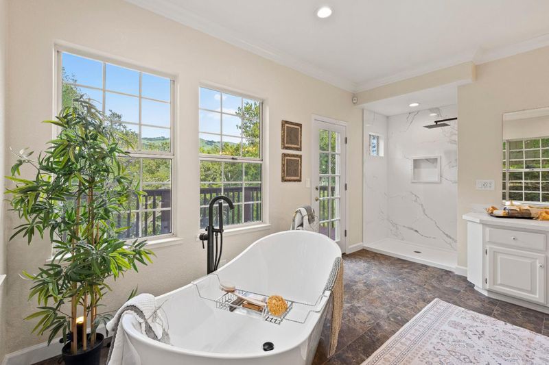 - Bidet, Double Sinks, Half on Ground Floor, Outside Access, Primary - Oversized Tub, Primary - Stall Shower(s), Shower over Tub - 1, Stall Shower - 2+, Stone, Updated Bath