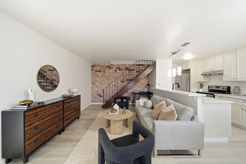 This beautifully remodeled corner-unit home offers peace and seclusion with no neighbors above or below. The thoughtfully designed layout features a private side entrance leading into an expansive lower-level floor plan, perfect for both relaxing and entertaining. Inside, the home boasts energy-efficient dual-pane windows and upgraded laminate flooring throughout the main living areas, while the staircase is finished with upgraded carpeting. The modern kitchen shines with crisp white cabinetry, elegant quartz countertops, and a full suite of included stainless steel appliances, including an electric range, dishwasher, and an upgraded refrigerator. Upstairs, you will find two spacious bedrooms flooded with natural light and a refreshed bathroom featuring an upgraded vanity and contemporary lighting. Beyond the interior, the property includes a dedicated patio for outdoor enjoyment and a convenient one-car shared garage, all perfectly situated just steps from the community pool and other amenities. This home offers a convenient location close to major freeways, a variety of dining and shopping options, and nearby local parks, making it an ideal place to call home.
