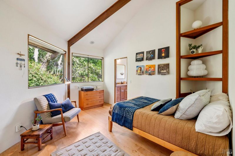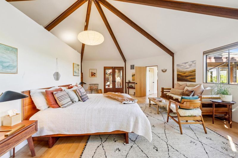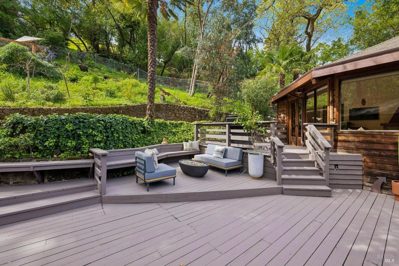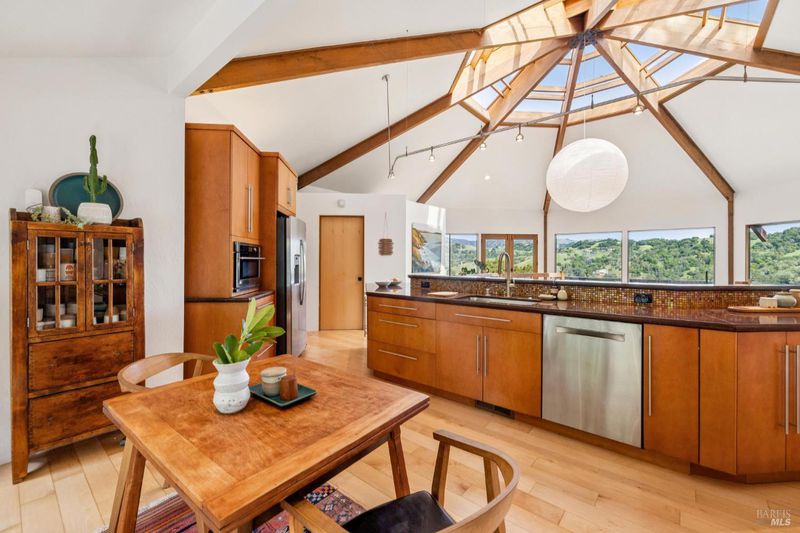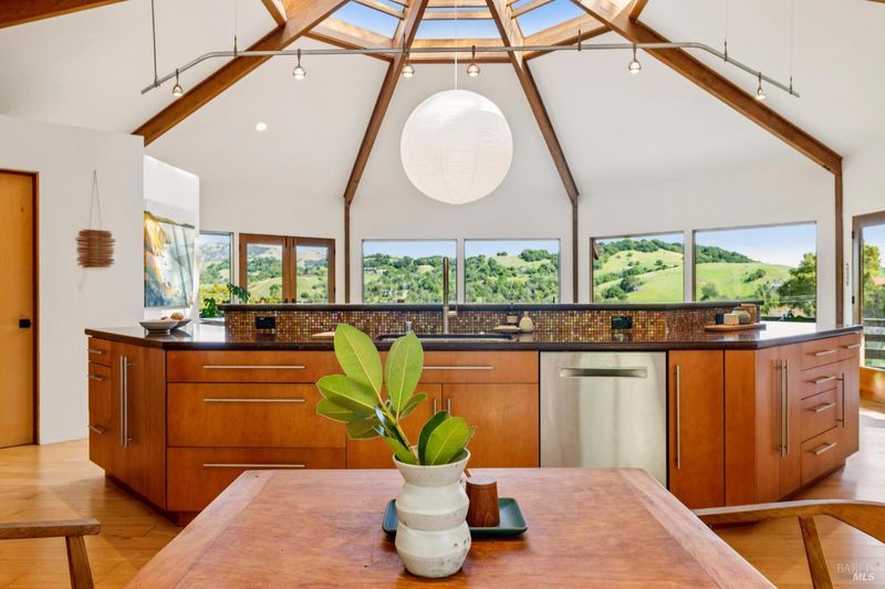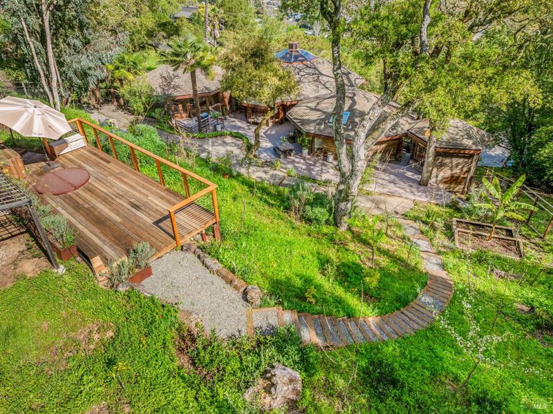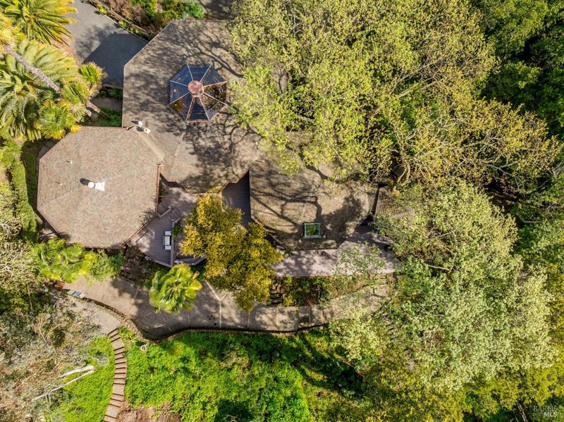 Dramatic and captivating, this distinctive home blends striking architecture with a magical setting in the hills of Sleepy Hollow. Designed to embrace its surroundings, the main living areas face sweeping 180-degree views across the valley, where the light shifts throughout the day and the hills glow golden at sunset. Inside, the open floor plan is filled with natural light from large skylights and warm tones that highlight the home's remarkable design. Four connected octagonal living spaces create a rare sense of flow, offering both expansiveness and warmth while providing phenomenal spaces for entertaining. The main skylight bathes the living room in natural light by day and frames the moon as it moves across the night sky, while the central fireplace creates a cozy haven on winter evenings. Expansive decks extend from the main living areas, creating seamless indoor-outdoor living and a setting where gatherings and memorable dinners unfold against a breathtaking natural backdrop. Outside, the property feels like a private retreat. A flourishing orchard of more than 50 varieties of fruit trees and garden spaces creates a vibrant landscape. At the top of the property, a hot tub overlooks the valleyan ideal place to unwind while watching golden sunsets, stargazing under the night sky, and listening to the quiet sounds of nature. Set at the end of a peaceful cul-de-sac, the property offers exceptional privacy and tranquility in one of Marin's most beloved communities. Known as a hidden gem in the hills of San Anselmo, Sleepy Hollow offers a warm, close-knit neighborhood, nearby trails, and a lifestyle deeply connected to nature. A truly special home offering space, light, privacy, and the magic of Sleepy Hollow living.