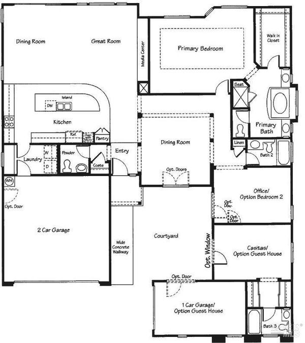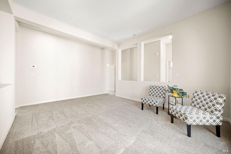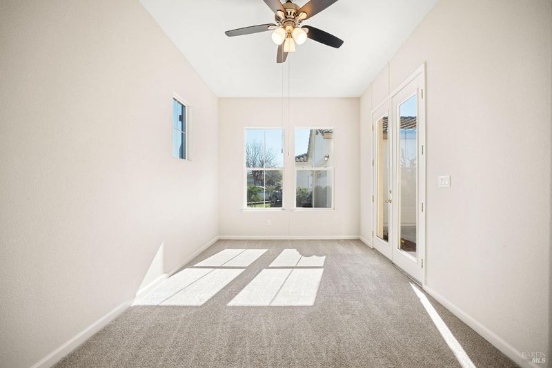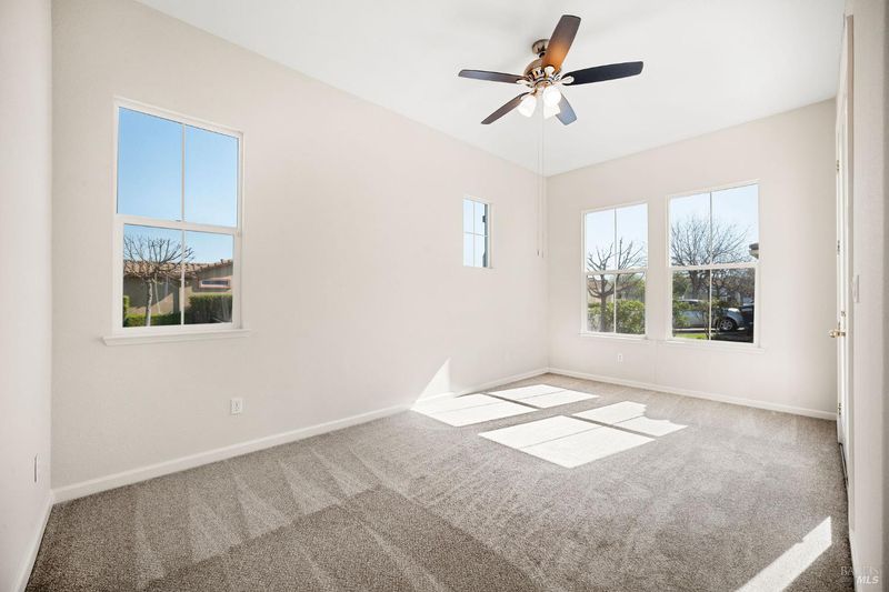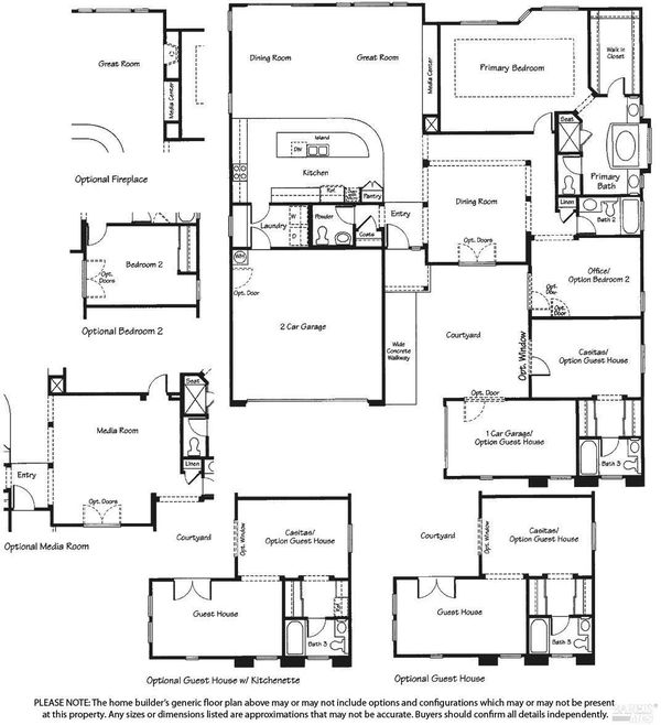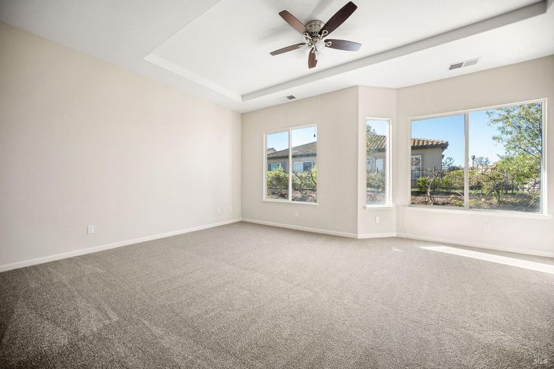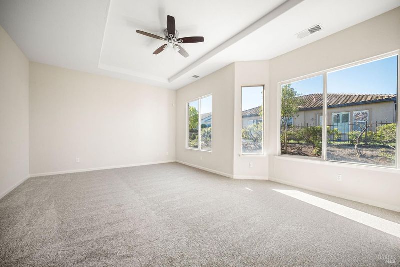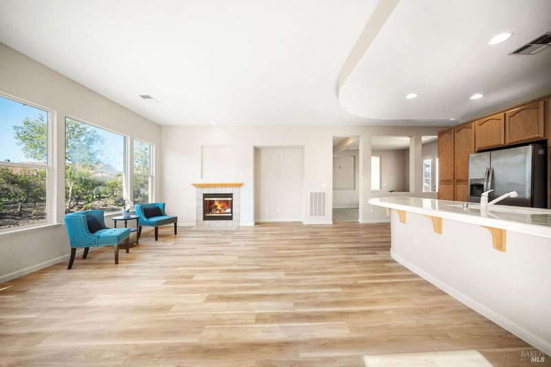 This Calistoga enjoys a delightful courtyard and sits on a spacious corner lot. Freshly painted inside and out, interior features include new luxury vinyl plank flooring in the entry, great room, kitchen, baths, and laundry new carpet in the bedrooms, office, halls, dining room, and casita, oak cabinetry throughout, fireplace in the great room, and a casita with private access from the courtyard. The open kitchen boasts a huge central island, tile countertops, appliances including a gas cooktop, new microwave and oven, and side by side refrigerator. A luxuriously large primary suite offers twin vanities, a roomy seated shower and soaking tub, and an enormous closet. Guests will enjoy a roomy suite (Casita) of their own with a large sitting room and a private courtyard entry. Trilogy is a 55+ community.