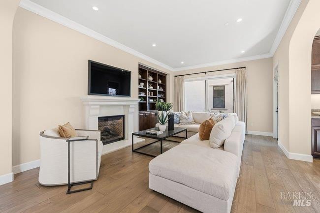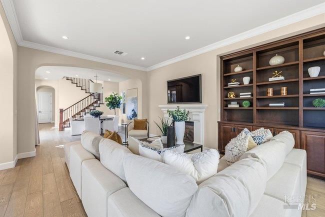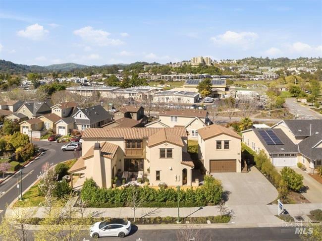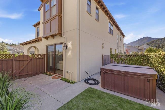 Situated in a desirable residential community just moments from downtown Larkspur, this thoughtfully crafted Santa Barbara style inspired residence offers refined architecture, generous living spaces, and beautifully curated finishes throughout. Positioned on a corner lot, the home enjoys an enhanced sense of openness while showcasing a graceful blend of European Costal character and timeless design elements. Wide-plank flooring carries through the main living areas, where a graciously scaled living room with an inviting fireplace, custom built-ins, and direct outdoor access creates a welcoming gathering space. The living room flows seamlessly into a combined dining and family room, forming one expansive area for everyday living and entertaining. Large sliding glass doors invite the outdoors in and extend the living spaces to the surrounding grounds. The gourmet kitchen is designed for both style and functionality, featuring sleek granite counters and backsplash, abundant cabinetry, a center island, and premium stainless appliances including a six-burner gas range. A private main-level guest suite provides comfortable accommodations for visitors. A striking staircase with elegant oil rubbed bronze balustrades leads to the upper level, where three serene en-suite bedrooms offer privacy and comfort. The primary suite captures breath taking views of Mount Tamalpais, complemented by a beautifully appointed bath with a calming neutral palette, soaking tub, dual vanities, walk-in shower, and separate water closet. A spacious laundry room adds everyday convenience and central air conditioning adds modern comfort to this beautifully designed home. A charming courtyard connects the main residence to a studio above the garage, creating an inviting outdoor setting ideal for unwinding or entertaining. The one-bedroom studio with full kitchen, stylish bath, and leafy outlooks, offering flexible space for guests, a home office, or extended living. A lush green turned side-yard has a hot tub to add an extra element of relaxation. Located just moments from Magnolia Avenue's restaurants, cafes, boutiques, and the historic Lark Theater, the property also enjoys close proximity to the Larkspur Ferry and Highway 101 for convenient commuting. With its spacious layout, private studio, and prime location near Piper Park and downtown Larkspur, the home offers an ideal setting for comfortable everyday living and effortless entertaining.