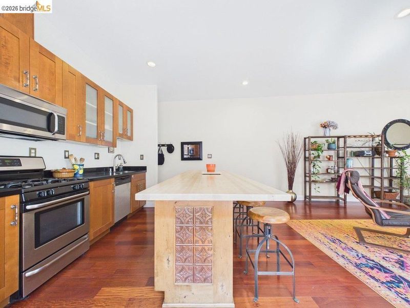 Converted from a former theater, this unique condo in the heart of West Oakland offers two large bedrooms, an updated bathroom, soaring 10' ceilings, a stylish kitchen with custom island, and secure parking and storage in garage. Spanning 1,189 square feet, the home is perfect for those seeking a comfortable retreat in a vibrant neighborhood. This thoughtfully renovated building offers interior entry through garage on Peralta or gate at 14th street, through a pristine and charming common staircase/hallway to the gorgeous oversized unit A. An abundance of natural light streaming through the dual pane windows, the warm laminate wood floors, and custom Urban Chic touches make this such a welcoming home. The unit includes private & romantic views of charming brick building from living room, roof tops and trees from the bedrooms! The central location is close to coffee shops, breweries, restaurants, parks, Sunday Farmer's Market, and the Mandela Parkway Greenspace!
