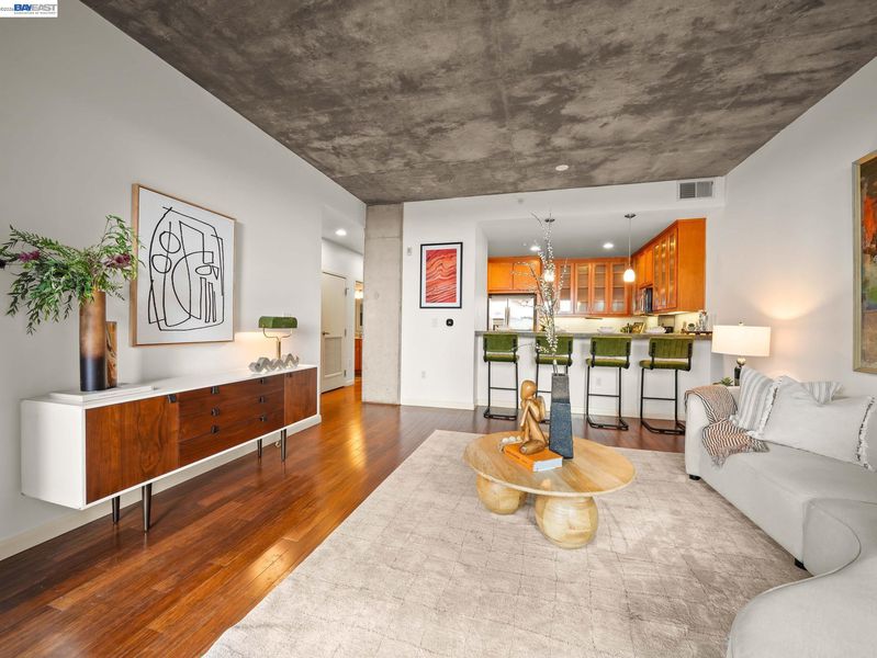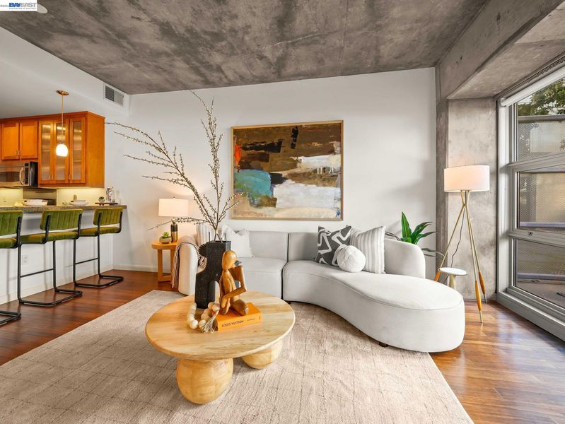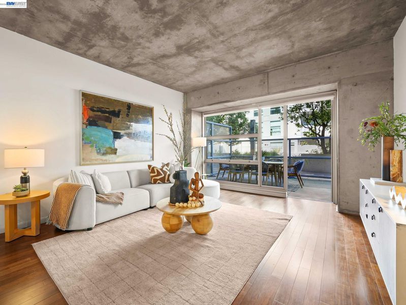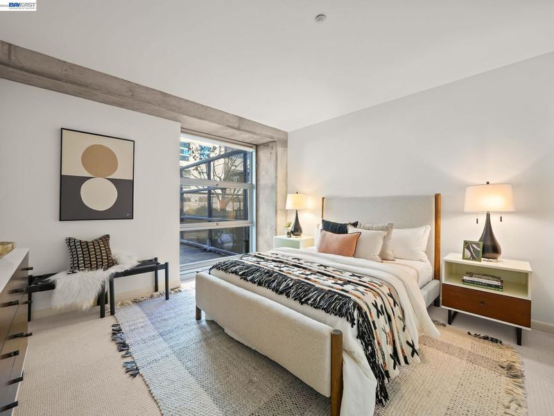Rare Jack London condo with an enormous private patio. 783 sq. ft. of living space plus a huge private patio make this one-bedroom at 428 Alice a true standout. Located in a desirable concrete-and-steel building, the home offers a spacious layout rarely found in downtown condos and a perfect mix of comfort, convenience, and city living. The generous bedroom features a custom walk-in closet and a large window with a convenient battery-operated shade. The well-equipped kitchen offers abundant cabinetry, a gas stove, and dishwasher, opening to the living area and flowing directly out to the expansive deeded secure patio—an exceptional extension of the living space and perfect for outdoor dining, relaxing, or entertaining.In the hallway you’ll find the in-unit washer/dryer, utility closet, and coat closet. The home also includes central heat and A/C, access to the building gym conveniently located next door, and a rare bonus: a large storage cage on the same floor as the deeded one-car covered parking.Step outside and enjoy great dining including Farmhouse Kitchen Thai Cuisine and Cafe Da Funk, along with many other neighborhood favorites. Commuting is easy via nearby 12th Street or Lake Merritt BART, or the ferry to San Francisco.