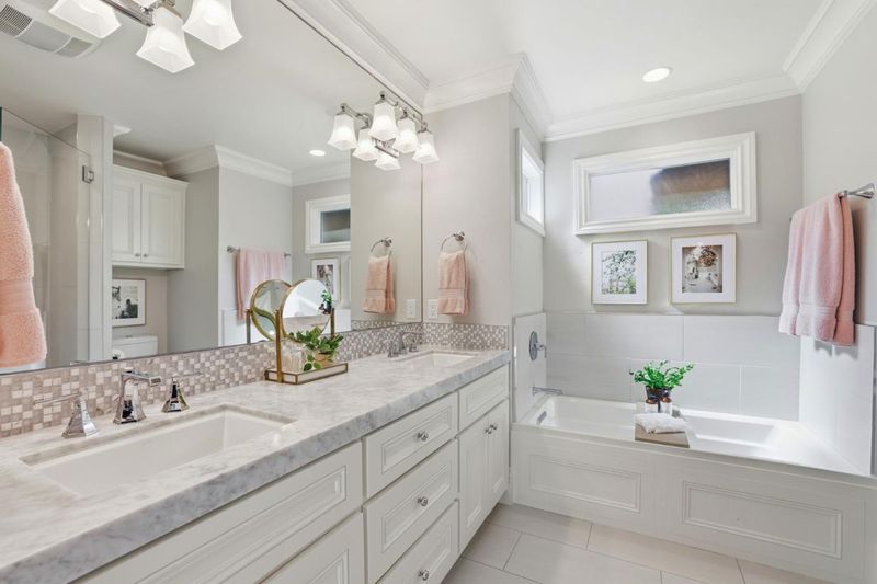 - Double Sinks, Full on Ground Floor, Marble, Oversized Tub, Primary - Oversized Tub, Primary - Stall Shower(s), Stall Shower - 2+, Tub in Primary Bedroom, Tubs - 2+, Updated Bath