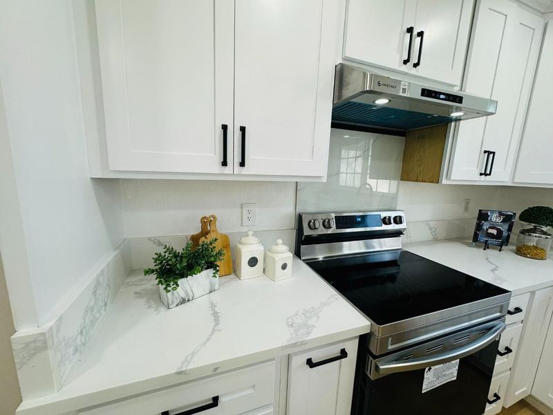 - Cooktop - Electric, Countertop - Quartz, Dishwasher, Exhaust Fan, Garbage Disposal, Hood Over Range, Oven - Self Cleaning, Oven Range - Electric, Pantry