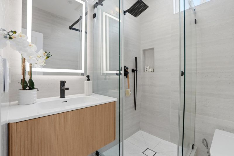 - Bidet, Dual Flush Toilet, Half on Ground Floor, Marble, Skylight, Stall Shower, Tile, Updated Bath